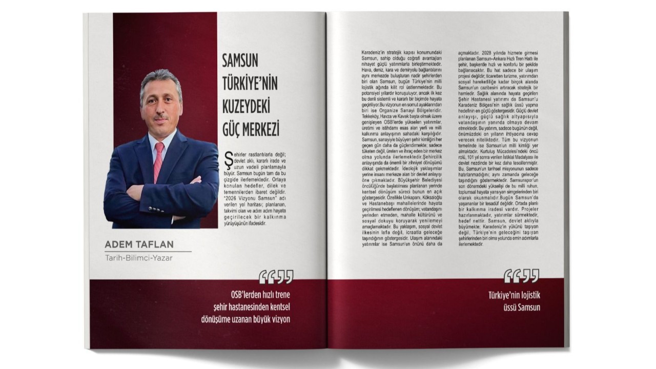 Dergide tarihçi, siyasetçi, bilimci ve yazar Adem Taflan imzasıyla yer alan “Samsun, Türkiye’nin Kuzeydeki Güç Merkezi” başlıklı yazıda, Samsun’un planlı kalkınma süreci ve uzun vadeli hedefleri değerlendirildi. Taflan, şehirlerin rastlantılarla değil; devlet aklı, kararlı irade ve uzun vadeli planlamayla büyüdüğünü belirterek, “2026 Vizyonu Samsun” yol haritasının somut takvimi olan bir kalkınma yürüyüşü olduğunu ifade etti.