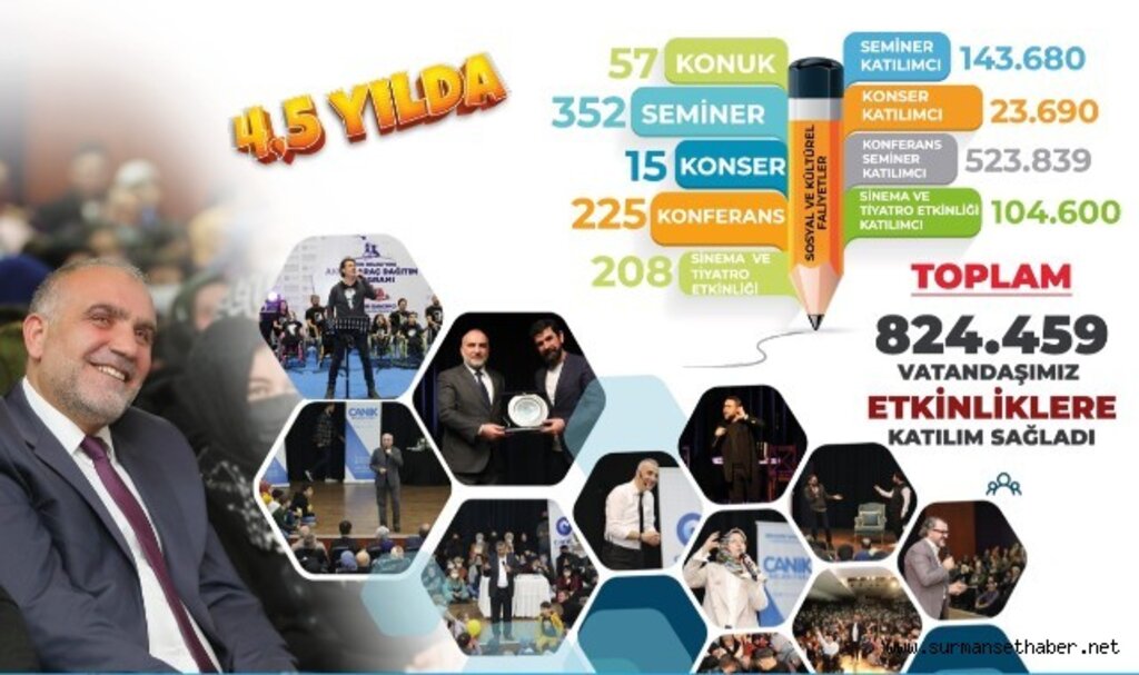 Canik Belediye Başkanı İbrahim Sandıkçı’nın kültür ve sanat alanında gerçekleştirdiği çalışmalar, yurt genelinde takdir toplamaya devam ediyor. Başkan İbrahim Sandıkçı’nın göreve geldiği 2019 yılından itibaren kültür ve sanat alanında büyük bir atılım yaşanan ilçede, 4.5 yılda 824 bin 459 vatandaşın katılımıyla 842 farklı kültür ve sanat programı gerçekleşti. Canik Belediyesi, 4.5 yıl içerisinde ilçede düzenlediği 57 konukla özel program, 352 seminer, 15 konser, 225 konferans ve 208 sinema ve tiyatro etkinliğiyle ilçede kültür ve sanat rüzgârı estirdi.