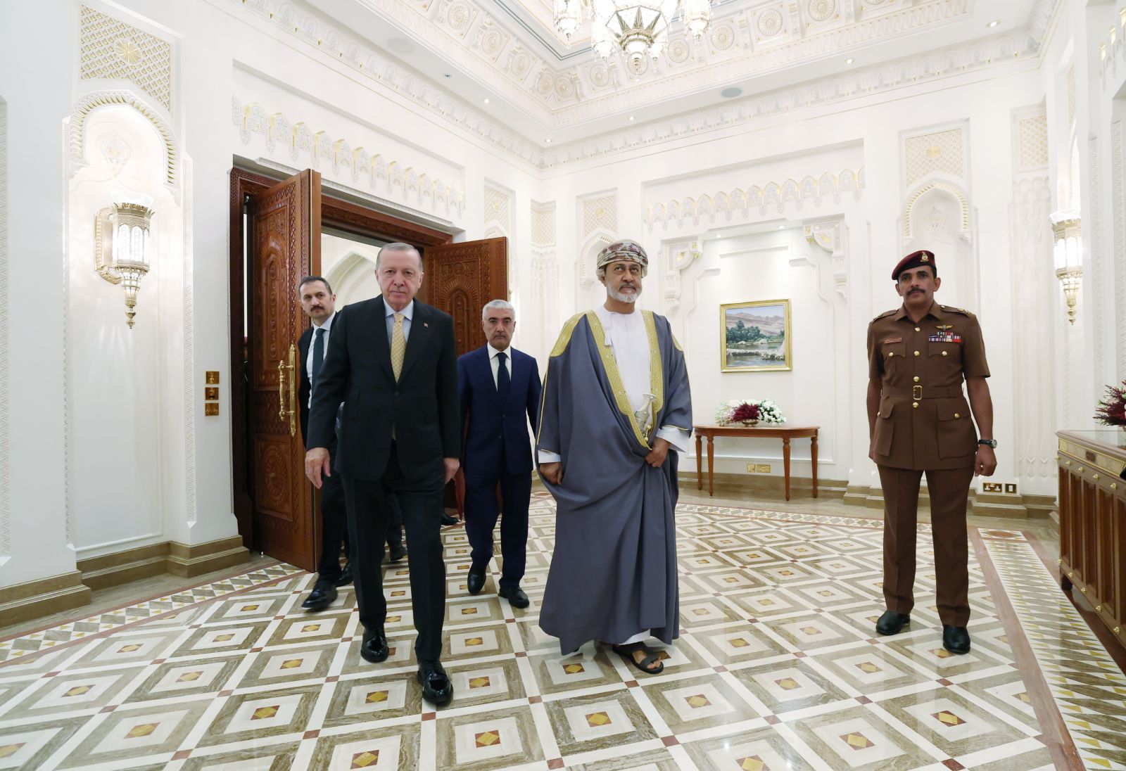 "Türkiye Cumhuriyeti Hükûmeti ile Umman Sultanlığı Hükûmeti Arasında Türkiye Maarif Vakfına Eğitim Kurumu İnşası ve İşletilmesi Amacıyla Arazi Tahsisine İlişkin İş Birliği Anlaşması", Umman İskan ve Şehir Bakanı Khalfan bin Saeed Al Shueli ile Türkiye Maarif Vakfı Başkanı Mahmut Özdil tarafından imzalandı."Umman Sultanlığı Enerji ve Maden Bakanlığı ile Türkiye Cumhuriyeti Enerji ve Tabii Kaynaklar Bakanlığı Arasında Madencilik ve Kritik Mineraller Alanında İş Birliği Mutabakat Zaptı", Umman Sinan Advanced Industries CEO'su Majid Al Hinai ile Aselsan Genel Müdürü Ahmet Akyol tarafından imza altına alındı.Daha sonra, Umman Sultanı Heysem bin Tarık Cumhurbaşkanı Erdoğan'ın onuruna öğlen yemeği verdi.