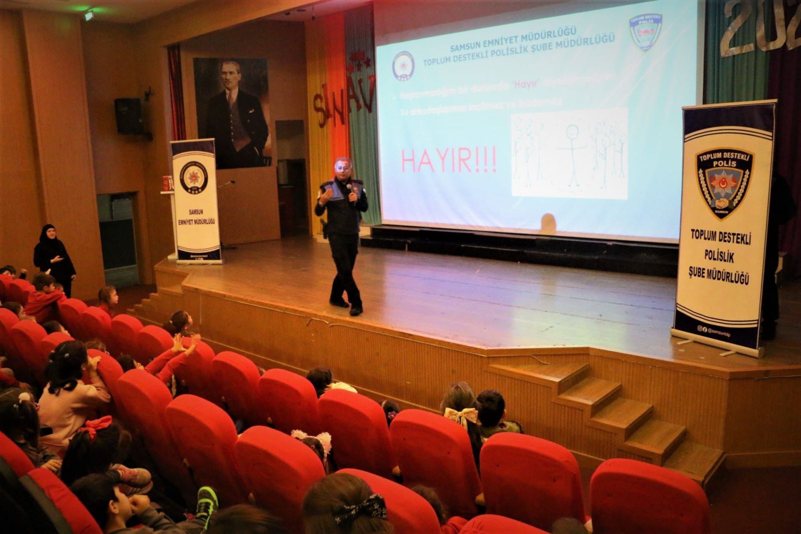 Samsun İl Emniyet Müdürlüğü Toplum Destekli Polislik Şube Müdürlüğü ekipleri, “Güvenli Mahallem, Güvenli Eğitim” projesi kapsamında öğrencilere yönelik bilgilendirme faaliyeti gerçekleştirdi.