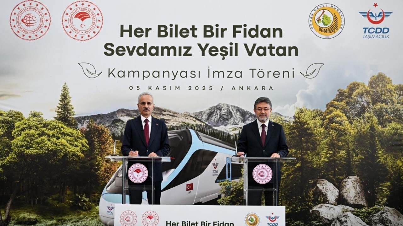 “13 Milyon Fidanı Toprakla Buluşturacağız”Törende basın mensuplarına açıklamada bulunan Bakan Uraloğlu, “Ormanlarımız; toprağımızın nefesi, suyumuzun kaynağı, iklimimizin hassas dengesi, biyo çeşitliliğimizin canlı kalesi, havamızın doğal filtresi, geleceğimizin teminatıdır. Ne yazık ki, özellikle yaz aylarında artan orman yangınları, küresel iklim değişikliğinin acı yüzünü bizlere hatırlatıyor. Bu yangınların azaltılması, ancak vatandaşlarımızın bilinç seviyesinin yükseltilmesi ve ormanlarımızı koruma sorumluluğunun içselleştirilmesiyle mümkündür.” ifadelerini kullandı.Söz konu protokolün bu bilinçle doğmuş bir proje olduğunu dile getiren Bakan Uraloğlu, sözlerine şu şekilde devam etti:“Her Bilet Bir Fidan Sevdamız Yeşil Vatan Kampanyası” ile; 11 Kasım 2025 – 11 Kasım 2026 tarihleri arasında 1 yıl boyunca Yüksek Hızlı Trenlerimizle; Ankara-İstanbul, Ankara-Eskişehir, Ankara-Konya, Ankara-Karaman, İstanbul-Konya, İstanbul-Karaman, Eskişehir-İstanbul, Ankara-Sivas ve Sivas-İstanbul yüksek hızlı tren hatlarımızda; seyahat eden her yolcumuz adına bir fidan dikeceğiz. Bu hatlarımızın genelinde yıllık ortalama 13 milyon yolcumuzun seyahat ettiğini düşündüğümüzde 13 milyon fidanı toprakla buluşturacağız.”Yolcuların, seyahatlerini tamamladıkları günün ertesinde, saat 10.00-12.00 arasında SMS ile bilgilendirileceğini kaydeden Bakan Uraloğlu, “Bu mesajda; YHT ile gerçekleştirdikleri yolculuk sayesinde karbon emisyonunun azaltılmasına katkı sağladıkları ve e-bilet kullanımıyla çevreye duyarlı bir tercih yaptıkları vurgulanacak. Ayrıca, dikilen fidana ait sertifikaya erişim linki de aynı gün hem SMS hem de kayıtlı e-posta adreslerine iletilecek. Böylece, her yolcumuz, yalnızca bir seyahat yapmış olmayacak; Yeşil Vatan’ın bir parçası, bir fidanın vesilesi olacak.” açıklamasında bulundu.Ulaştırma ve Altyapı Bakanlığı Kurumsal Karbon Ayak İzi Hesaplamasını Türkiye’de İlk Gerçekleştiren BakanlıkUlaştırma ve Altyapı Bakanlığı olarak, doğanın ve çevrenin korunması hassasiyetlerini yalnızca sözde değil, icraat ile de gösterdiklerini belirten Bakan Uraloğlu, “Ulaştırma yatırımlarımızı yalnızca ekonomik büyüme değil, çevresel sürdürülebilirlik ilkeleriyle de şekillendiriyoruz. Kurumsal karbon ayak izi hesaplamasını Türkiye’de ilk gerçekleştiren Bakanlık olarak, çevre bilinci hizmet anlayışımıza liderlik etmekten gurur duyuyoruz. İklim kriziyle mücadelede öncü bir rol üstlenerek, çevreye duyarlı, karbon emisyonunu azaltan ulaşım sistemlerini hayata geçiren projeler geliştiriyoruz.” dedi.Uraloğlu, yakın bir zaman önce başlattıkları “Türkiye’nin Ulaşımda Net Sıfır Emisyon Yol Haritası” projesini, Avrupa Birliği mali iş birliği çerçevesinde finanse ederek; sektördeki tüm ulaşım modlarını kapsayacak şekilde yürüttüklerini de kaydetti. Uraloğlu, söz konusu proje hakkında şu bilgileri paylaştı:“Bu proje, ulaşım faaliyetlerinden kaynaklanan sera gazı emisyonlarını sıfıra indirmeye yönelik etkili bir çerçeve oluşturmayı hedefliyor. Proje kapsamında geliştirilen emisyon modeliyle; karayolu, demiryolu, havayolu, denizyolu ulaşım modlarının mevcut durumunu analiz ederek, farklı senaryolara göre aktivite tahminleri, araç sayısı, yakıt türü ve emisyon projeksiyonları oluşturuyoruz.”23 Yılda 97 Milyon Fidan Toprakla BuluştuUraloğlu, Karayolları Genel Müdürlüğünün (KGM), Orman Genel Müdürlüğünden (OGM) sonra en fazla ağaç diken kamu kuruluşu olduğunu ifade ederek, KGM’nin son 10 yılda yıllık ortalama 4,3 milyon adet fidan ve ağaç dikimi gerçekleştirdiğini kaydetti. Uraloğlu, Bakanlık olarak da son 23 yılda da 97 milyon fidanı toprakla buluşturduklarının altını çizdi.Uraloğlu ayrıca, 6 bin 101 kilometre olan bölünmüş yol uzunluğunu 30 bin kilometreye yaklaştırarak kesintisiz trafik akışıyla yıllık 6,3 milyon ton daha az karbondioksit salınımı gerçekleştirdiklerine dikkati çekti.“Karayolu Taşımacılığında Yeşil Dönüşümü Sürdürülebilirliğin Merkezine Yerleştiriyoruz”Ekolojik köprüler, bisiklet yolları, Güneş Enerji Santralleri ve asfalt geri dönüşüm tesisleriyle karbon ayak izini azalttıklarını söyleyen Uraloğlu, sözlerine şu şekilde devam etti:“Yıllık 2 milyon ton asfaltın geri kazanımıyla kaynak ve enerji verimliliği sağlıyoruz. Hiç şüphesiz fosil yakıtlardan temiz enerjiye geçişte elektrikli araçlar da kritik bir rol oynuyor. Türkiye genelinde 2025 itibarıyla trafiğe kayıtlı elektrikli araç sayısı 320 bini aşmıştır. Şarj soket sayısı 35 bini, lisanslı firma sayısı 170’i geçerek Avrupa ortalamasının üzerine çıkmıştır. Bu artışları çok olumlu buluyor ve elektrikli araçlarla temiz enerjiye geçişi destekleyerek karayolu taşımacılığında yeşil dönüşümü sürdürülebilirliğin merkezine yerleştiriyoruz. Elektrikli kamyon, otobüs, minibüs, çekici ve otomobillerin sektörde kullanımına imkan sağlayacak mevzuat düzenlemeleri yapıyoruz.”Akıllı Ulaşım Sistemleri’nin de trafik akışının iyileştirilmesi yoluyla emisyonların azaltılmasını sağladığını söyleyen Uraloğlu, “Bu noktada Kooperatif AUS test ve Uygulama Koridoru ile dünyadaki yenilikçi teknolojilerin ülkemizde uygulanması sağlıyoruz. İstanbul ve Antalya’da Kooperatif Akıllı Ulaşım Sistemleri (K-AUS) pilot uygulamalarına başladık. Akıllı ulaşım sistemlerini yaygınlaştırmak için fiber optik altyapımızı karayolu genelinde yaygınlaştıracağız.” dedi.“Marmaray Projemizle 62 Milyon Ton Karbon Emisyonunu Engelledik”Demiryolunda yük taşımacılığı payını da yüzde 5’ten yüzde 22’ye yükseltmek için projeyle daha güvenli, dengeli 