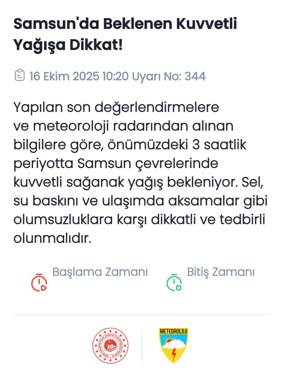 Meteoroloji Genel Müdürlüğü, Samsun ili için önümüzdeki 3 saatlik periyotta kuvvetli yağış beklendiğini duyurdu. Sabah saatlerinde başlayan sağanak yağmurun, Meteoroloji radarından alınan bilgilere göre şiddetini artırarak devam edeceği bildirildi.
