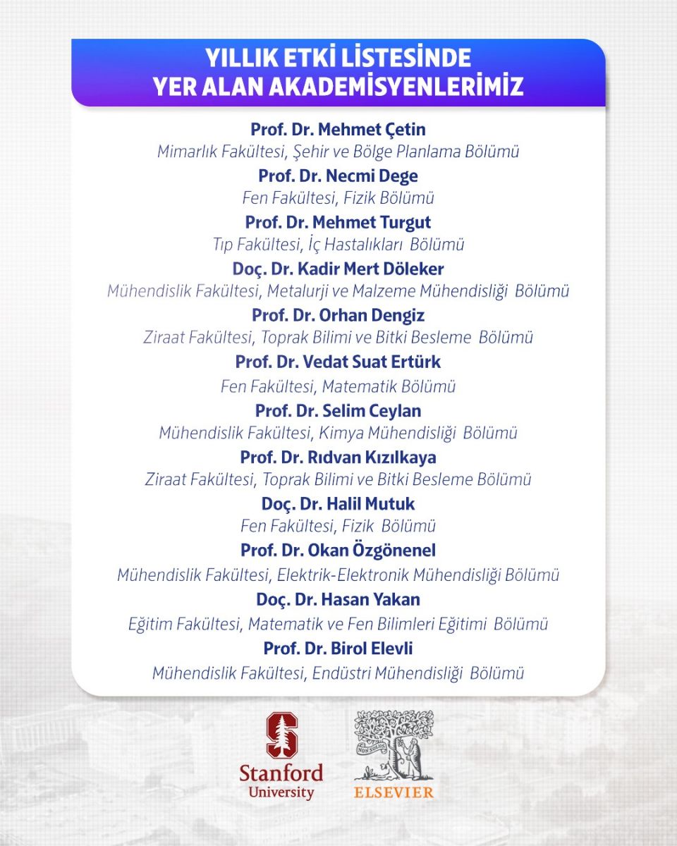 OMÜ’den Yıllık Etki Listesine girenler• Prof. Dr. Mehmet Çetin (Mimarlık Fakültesi, Şehir ve Bölge Planlama)• Prof. Dr. Necmi Dege (Fen Fakültesi, Fizik)• Prof. Dr. Mehmet Turgut (Tıp Fakültesi, İç Hastalıkları• Doç. Dr. Kadir Mert Döleker (Mühendislik Fakültesi, Metalurji ve Malzeme Mühendisliği)• Prof. Dr. Orhan Dengiz (Ziraat Fakültesi, Toprak Bilimi ve Bitki Besleme)• Prof. Dr. Vedat Suat Ertürk (Fen Fakültesi, Matematik Bölümü, Uygulamalı Matematik Anabilim Dalı)• Prof. Dr. Selim Ceylan (Mühendislik Fakültesi, Kimya Mühendisliği)• Prof. Dr. Rıdvan Kızılkaya (Ziraat Fakültesi, Toprak Bilimi ve Bitki Besleme)• Doç. Dr. Halil Mutuk (Fen Fakültesi, Fizik)• Prof. Dr. Okan Özgönenel (Mühendislik Fakültesi, Elektrik-Elektronik Mühendisliği)• Doç. Dr. Hasan Yakan (Eğitim Fakültesi, Matematik ve Fen Bilimleri Eğitimi)• Prof. Dr. Birol Elevli (Mühendislik Fakültesi, Endüstri Mühendisliği)