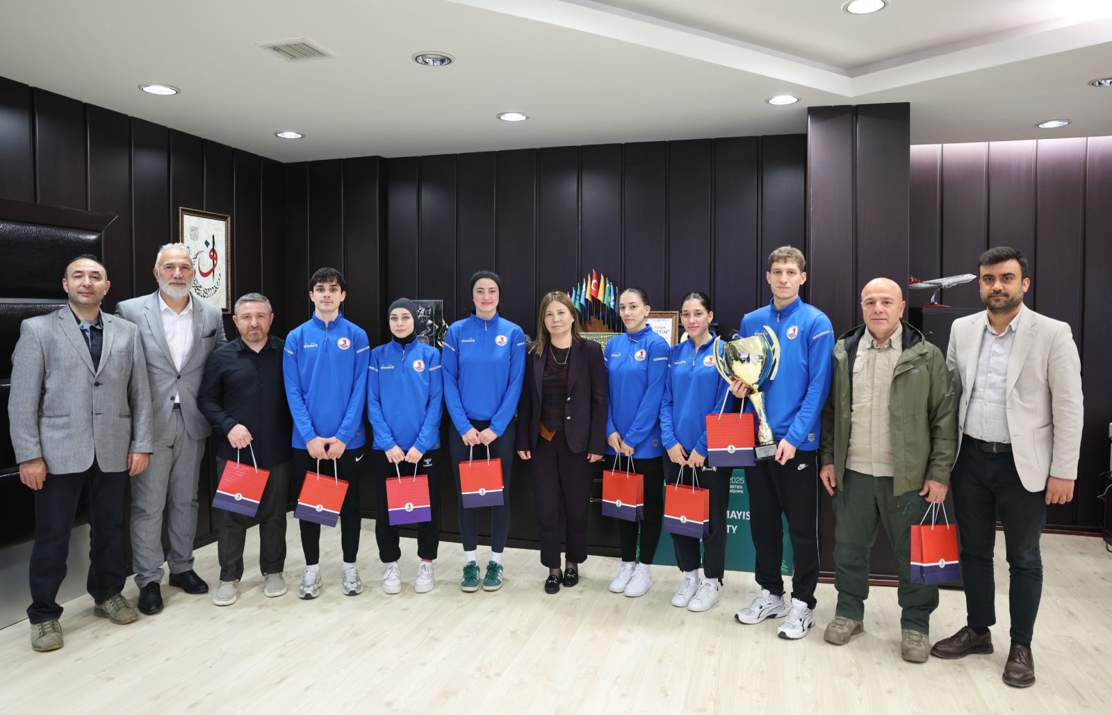 Ziyarete Yaşar Doğu Spor Bilimleri Fakültesi Dekanı Prof. Dr. Murat Eliöz, Dekan Yardımcısı Prof. Dr. Yıldırım Kayacan, Sağlık Kültür Spor Daire Başkanı Öğr. Gör. Selman Aslan ile antrenörler Sebahattin Yaşar ve Engin Keskin de katıldı. Rektör Aydın, elde edilen büyük başarı nedeniyle sporcuları tebrik ederek, OMÜ’nün spor alanındaki gücünü bir kez daha gösterdiğini belirtti.Ziyaret sırasında Rektör Aydın’a birincilik kupası ve forma hediye edildi.