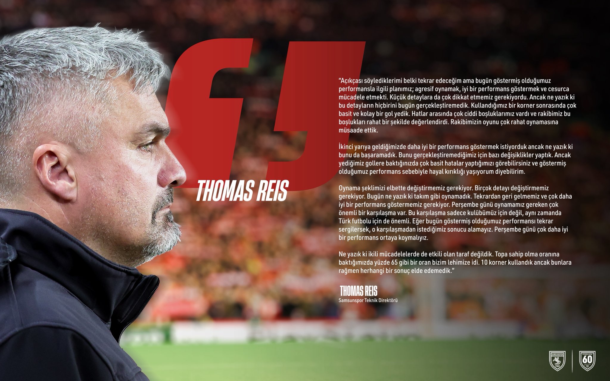 İkinci yarıda daha iyi bir performans ortaya koymayı hedeflediklerini ancak bunda da başarılı olamadıklarını söyleyen Reis, yaptıkları oyuncu değişikliklerinin de sonucu değiştirmediğini ifade etti. Yedikleri gollerin basit hatalardan kaynaklandığını belirten Reis, takım olarak beklenen seviyede olmadıklarını söyledi.