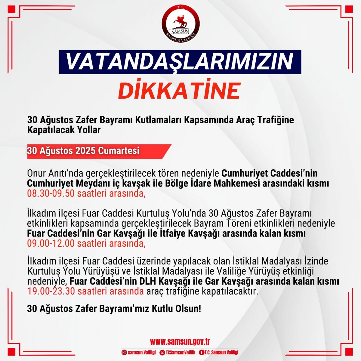 Valilikten yapılan açıklamaya göre, Cumhuriyet Meydanı’nda gerçekleştirilecek resmi tören nedeniyle Cumhuriyet Caddesi’nin Cumhuriyet Meydanı iç kavşak ile Bölge İdare Mahkemesi arasındaki bölümü 08.30-09.50 saatleri arasında araç trafiğine kapalı olacak.Samsun’da Trafiğe Kapatılacak Yollar ve SaatlerFuar Caddesi (Gar Kavşağı – İtfaiye Kavşağı arası) 09.00 – 12.00 Bayram töreni etkinlikleri kapsamında kapalı olacak.Fuar Caddesi (DLH Kavşağı – Gar Kavşağı arası) 19.00 – 23.30 “İstiklal Madalyası İzinde Kurtuluş Yolu Yürüyüşü” ve “Valiliğe Yürüyüş” etkinliği nedeniyle kapalı olacak.Valilik, vatandaşların Trafik düzenlemelerine dikkat etmelerini ve alternatif güzergâhları kullanmalarını istedi.Samsun Valiliği ayrıca tüm vatandaşların 30 Ağustos Zafer Bayramı’nı kutladı.