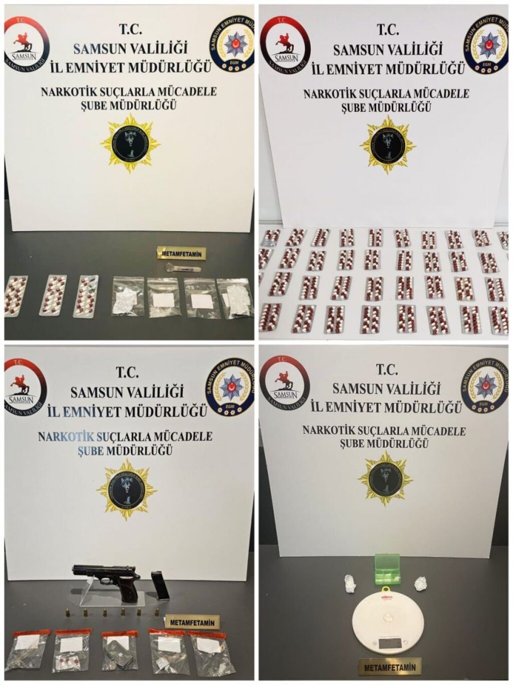 Samsun İl Emniyet Müdürlüğü polis ekiplerince İlkadım, Atakum ve Canik ilçelerinin farklı mahallelerinde gerçekleştirilen denetim, uygulama ve operasyonlarda haksız kazanç sağlamak amacıyla, uyuşturucu madde ticareti, nakli veya depolanması faaliyetlerini yürüten şahıs/şahıslara yönelik olarak yapılan çalışmalar da çeşitli uyuşturucu madde ve suç unsurları ele geçirildi, 25 kişi gözaltına alındı.İlkadım ve Atakum, Canik ilçelerinin farklı mahallelerinde şüpheli 25 şüphelinin üzerlerinde, araçlarında ve ikametlerinde yapılan aramalarda: 877 adet sentetik ecza,