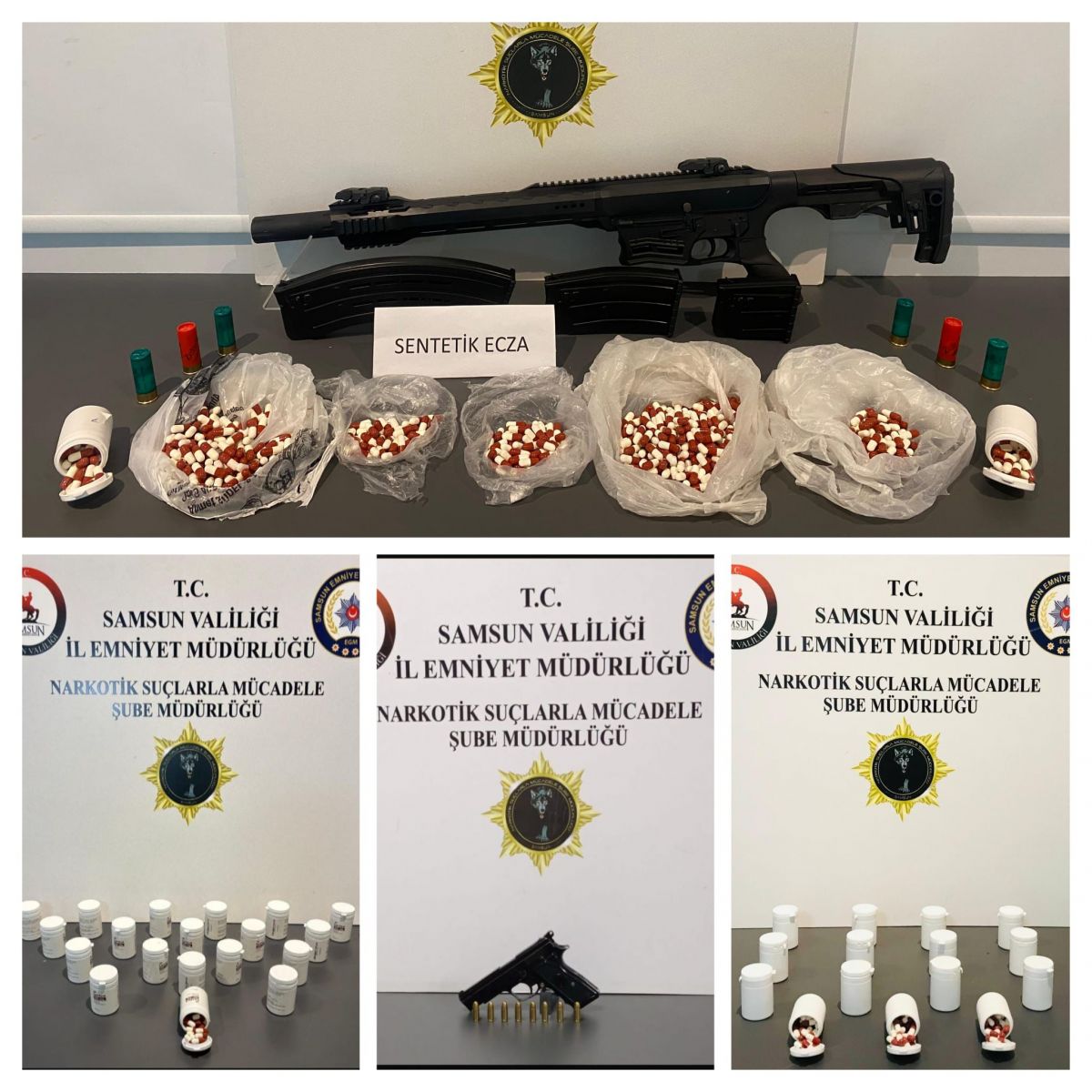 Samsun’da Narkotik Suçlarla Mücadele Şube Müdürlüğü ekiplerince İlkadım ve Atakum ilçelerinde gerçekleştirilen operasyonlarda, çok sayıda uyuşturucu madde, silah ve suç aleti ele geçirildi.Yapılan operasyonda;2 bin 408 adet sentetik ecza,13,08 gram metamfetamin,2,47 gram esrar,1,48 gram sentetik kannabinoid,1 adet esrarlı sigara,5 adet uyuşturucu kullanım aparatı,1 adet hassas terazi,1 adet ruhsatsız tabanca,1 adet ruhsatsız tüfek ve 6 adet tüfek kartuşu ele geçirildi.Operasyon kapsamında ayrıca “Uyuşturucu Madde Ticareti Yapmak” ve “Hırsızlık” suçlarından aranan 2 kişi yakalandı. Toplamda 6 şüpheli hakkında adli işlem başlatıldı.Emniyet yetkilileri, uyuşturucu ile mücadelenin kararlılıkla devam edeceğini vurgulayarak, “Uyuşturucunun gölgesi bile kalmayacak, mücadelemiz sonuna kadar sürecek” mesajını verdi.