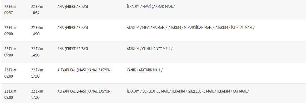 İlkadım ilçesinde Fevzi Çakmak Mahallesi’nde 09.57-10.57 saatleri arasında, Çay, Derebahçe ve Güzeldere mahallelerinde ise 08.00-17.00 saatleri arasında su verilemeyecek.