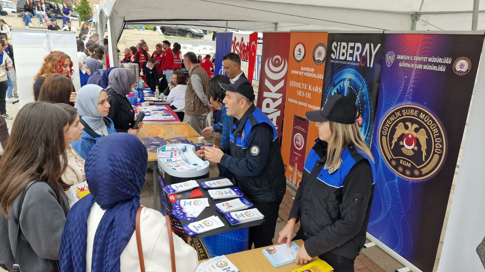 29 Eylül 2025 Pazartesi günü 19 Mayıs Üniversitesi Kurupelit Kampüsü Yaşam Merkezi önünde kurulan bilgilendirme stantlarında; Toplum Destekli Polislik, Terörle Mücadele, Narkotik Suçlarla Mücadele, Güvenlik, Siber Suçlarla Mücadele ve Asayiş Şube Müdürlüğü personelleri görev aldı.