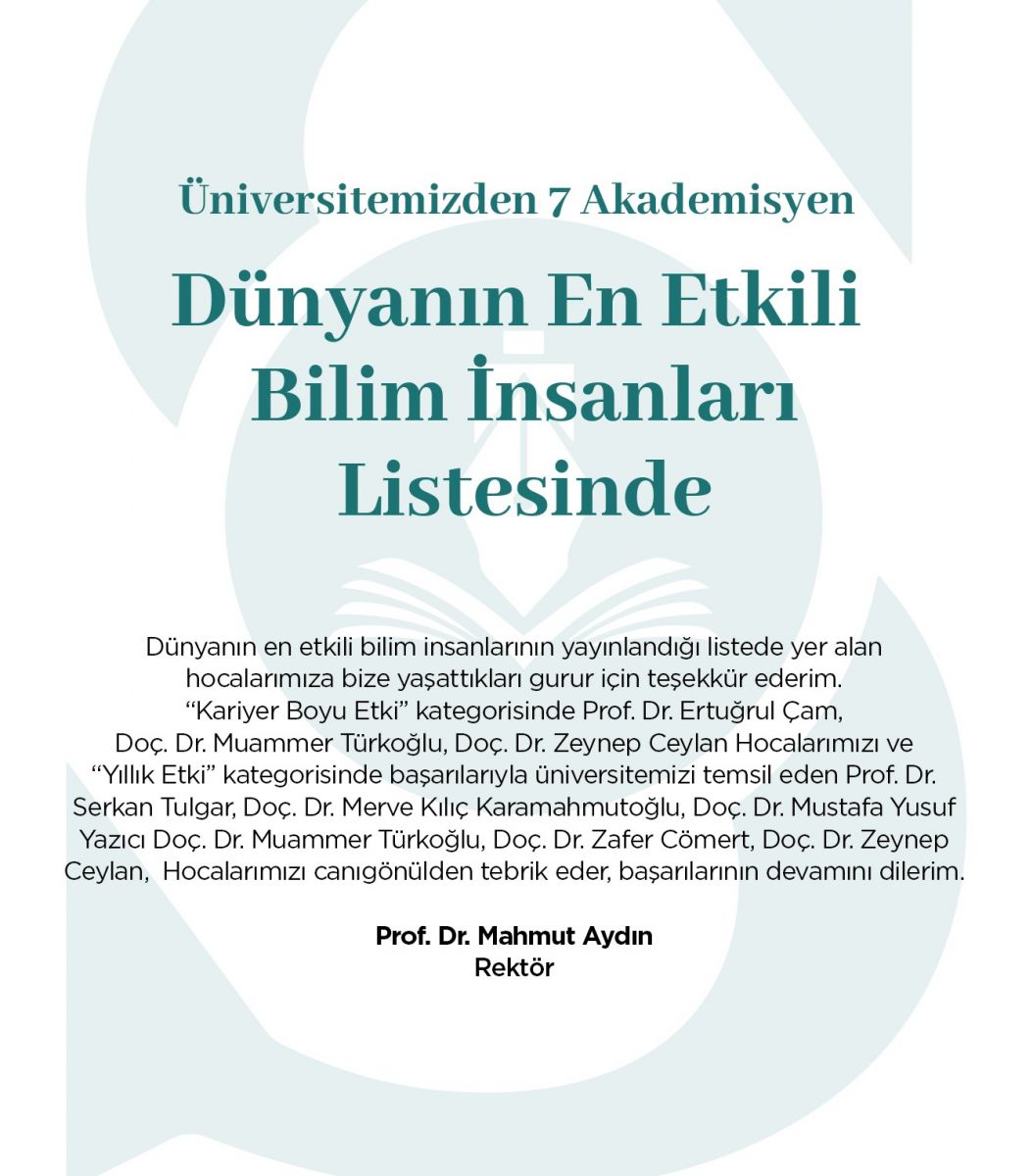 Üniversitemizden 7 akademisyen, Stanford Üniversitesi ile Hollanda merkezli bilimsel yayın kuruluşu Elsevier’in iş birliğiyle hazırlanan “Dünyanın En Etkili Bilim İnsanları” listesine girdi. 2025 yılı güncellemesiyle yayımlanan bu prestijli listede, bilimsel üretkenliği ve uluslararası atıf etkisiyle öne çıkan araştırmacılar yer aldı.Science-Metrix sınıflandırmasına göre 22 ana alan ve 174 alt alanda yapılan değerlendirmelerde, en az 5 makalesi bulunan ve c-score sıralamasında ilk 100.000’e girenler veya kendi alanında ilk %2’lik dilimde yer alan bilim insanları listeye dahil edildi.Üniversitemiz Rektörü Prof. Dr. Mahmut Aydın, elde edilen başarıların hem bilimsel üretkenliğin hem de uluslararası ölçekteki etkinin bir göstergesi olduğunu vurgulayarak şu ifadeleri kullandı: “Dünyanın en etkili bilim insanlarının yayınlandığı listede yer alan hocalarımıza bize yaşattıkları gurur için teşekkür ederim. “Kariyer Boyu Etki” kategorisinde Prof. Dr. Ertuğrul Çam, Doç. Dr. Muammer Türkoğlu, Doç. Dr. Zeynep Ceylan Hocalarımızı ve “Yıllık Etki” kategorisinde başarılarıyla üniversitemizi temsil eden Prof. Dr. Serkan Tulgar, Doç. Dr. Merve Kılıç Karamahmutoğlu, Doç. Dr. Mustafa Yusuf Yazıcı Doç. Dr. Muammer Türkoğlu, Doç. Dr. Zafer Cömert, Doç. Dr. Zeynep Ceylan, Hocalarımızı canıgönülden tebrik eder, başarılarının devamını dilerim.”