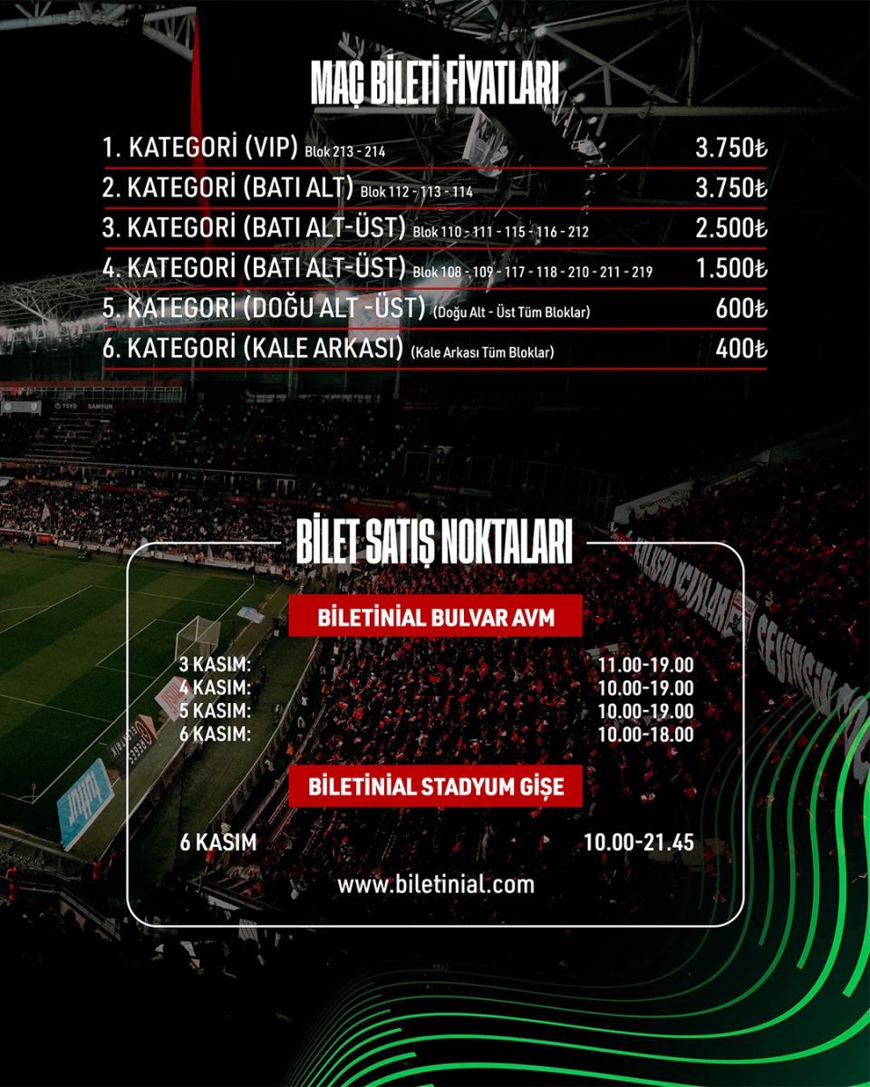 Kulüp tarafından yapılan açıklamada, taraftarların paket biletleri hem internet üzerinden hem de Biletinial gişelerinden temin edebileceği belirtildi. Satışlarda öncelik Samsunspor logolu kart sahiplerine tanınacak. Diğer kart sahipleri ise satışlara maçtan 24 saat önce erişebilecek.