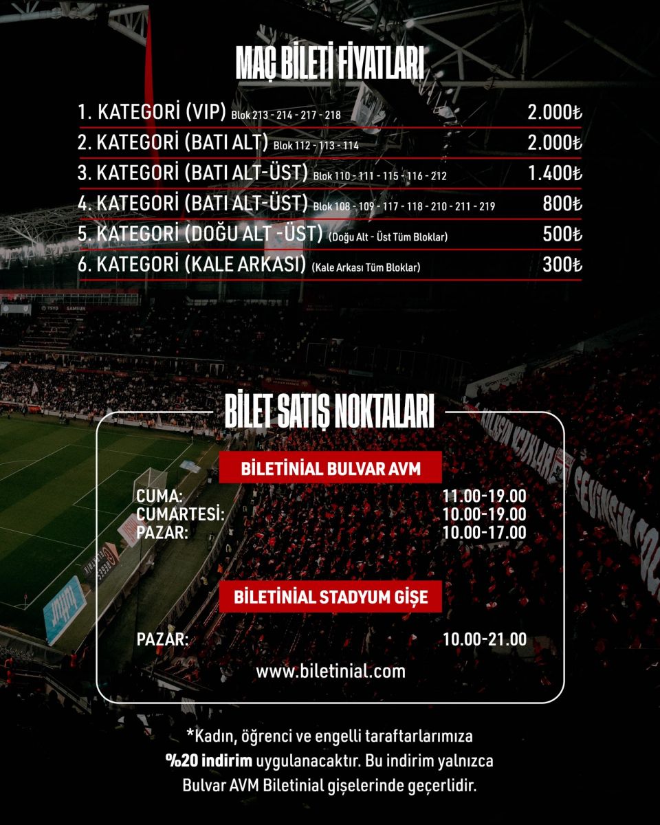 Bulvar AVM Biletinial gişesinden yapılan alımlarda kadın, öğrenci ve engelli taraftarlar, tüm tribünlerde geçerli yüzde 20 indirimden yararlanabilecek.