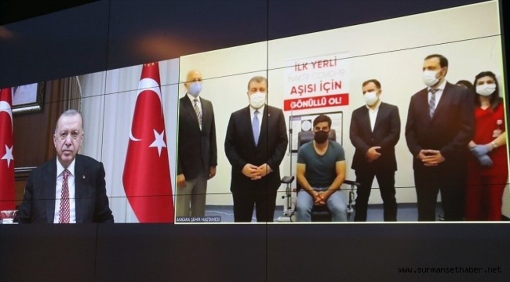 Cumhurbaşkanı Recep Tayyip Erdoğan, yerli Kovid-19 aşısının üçüncü fazının ilk doz uygulamasına, video konferans ile katıldı.